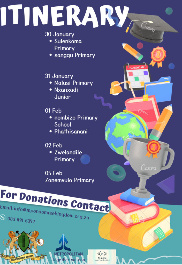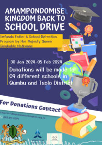 A Statistics South Africa (StatsSA) General Household Survey reported that approximately 51% of learners who start Grade 1 will complete Grade 12 and obtain a National Senior Certificate. It is further estimated that 250 000 learners drop out of school every year. The Department of Basic Education has come up with several prevention strategies to ensure that these statistics are decreasing each year In its efforts to support these strategies, the Amampondomise Kingdom under HRH Queen Sinokuhle Matiwane have A school retention Program initiative to promote school retention and completion by children and adolescent youth of the Amampondomise Kingdom.Part of the Kings and Queens role is to regulate social behavior, promote social cohesion and preserve the traditions and customs of the people best integrated within a democratic society. Founded upon the African Proverb “it takes a village to raise a child”, to the Amampondomise Kingdom education is not only a tool to skill individuals and breaking the cycle of poverty but it is a critical institution where acceptable social norms and values of respect, responsibility, justice, good etiquette, discipline and compassion can be further nurtured to ensure good citizens and prosperous communities.This is a annual program coordinated by the Queen that aims at assisting under privileged children in our rural communities with school necessities. The Queen donates School shoes school uniform, backpacks, stationery, textbooks and many other items to children in different schools within our kingdom.